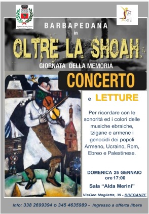 Domenica 25 gennaio a Breganze/Vi ore 17.00 c/o Sala Polifunzionale “Alda Merini” (via Gen. Maglietta, 39): “Oltre la Shoah” – concerto con letture per il Giorno della Memoria, per non dimenticare anche gli attuali genocidi, organizzato dal Comune di Breganze e dal gruppo danze popolari “Bredanze”.
